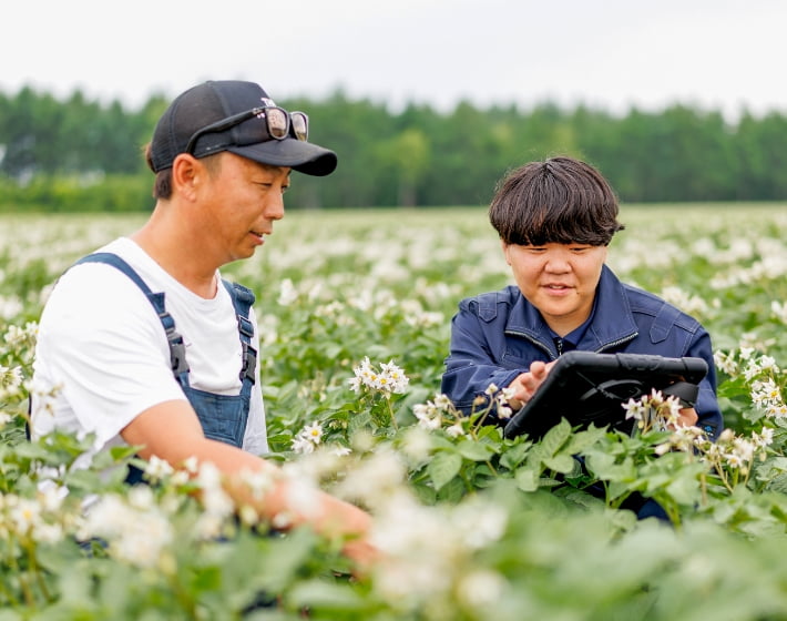 より高品質で高収量なじゃがいもを収穫するために、契約生産者への栽培支援や収穫サポートを行います。
